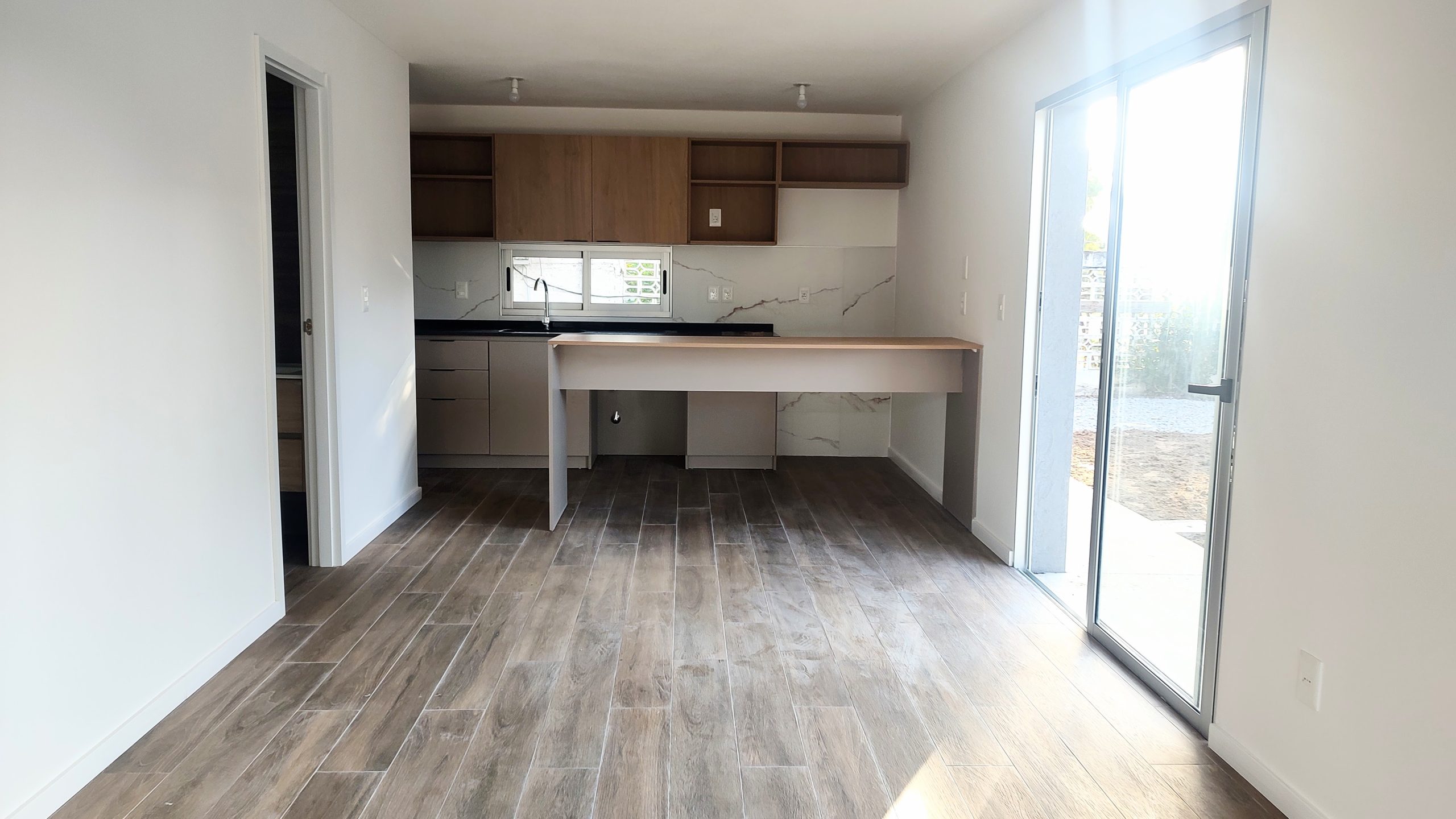 Living comedor, cocina integrada y bańo social con conexión a lavarropa.